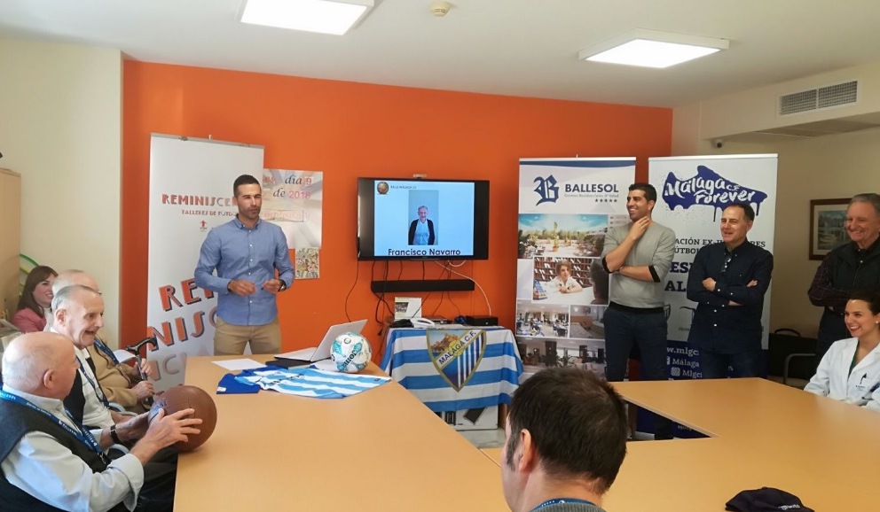 Málaga, 10 de abril de 2018. La Residencia Teatinos del Grupo Ballesol acogió la sesión inaugural del nuevo taller de fútbol “Reminiscencia” que, dentro del Proyecto de Reminiscencia basado en el fútbol para personas mayores con deterioro cognitivo, impulsado conjuntamente entre FEAFV (Federación Española de Asociaciones de Futbolistas Veteranos) y AFE (Asociación de Futbolistas Españoles), se implementará en la capital malagueña con la participación y colaboración tanto de la Asociación de Ex Futbolistas del Málaga CF como del club costasoleño.
