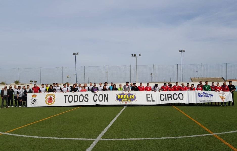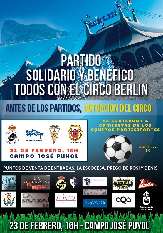 La Línea de La Concepción (Cádiz), 23 de febrero de 2019. El pasado 1 de febrero, el fuerte viento que azotó la Línea de la Concepción se cobró sus primeras consecuencias. La carpa del Circo Berlín se desplomó por completo, destrozándola. Por suerte no hubo víctimas pero sí daños materiales, que alcanzaron los 100.000 euros y dejaron a 30 familias que se dedican a esta profesión sin medios para trabajar. El municipio se volcó y la Asociación de veteranos de la Real Balompédica Linense organizó este evento deportivo para recaudar fondos a beneficio del Circo Berlín.