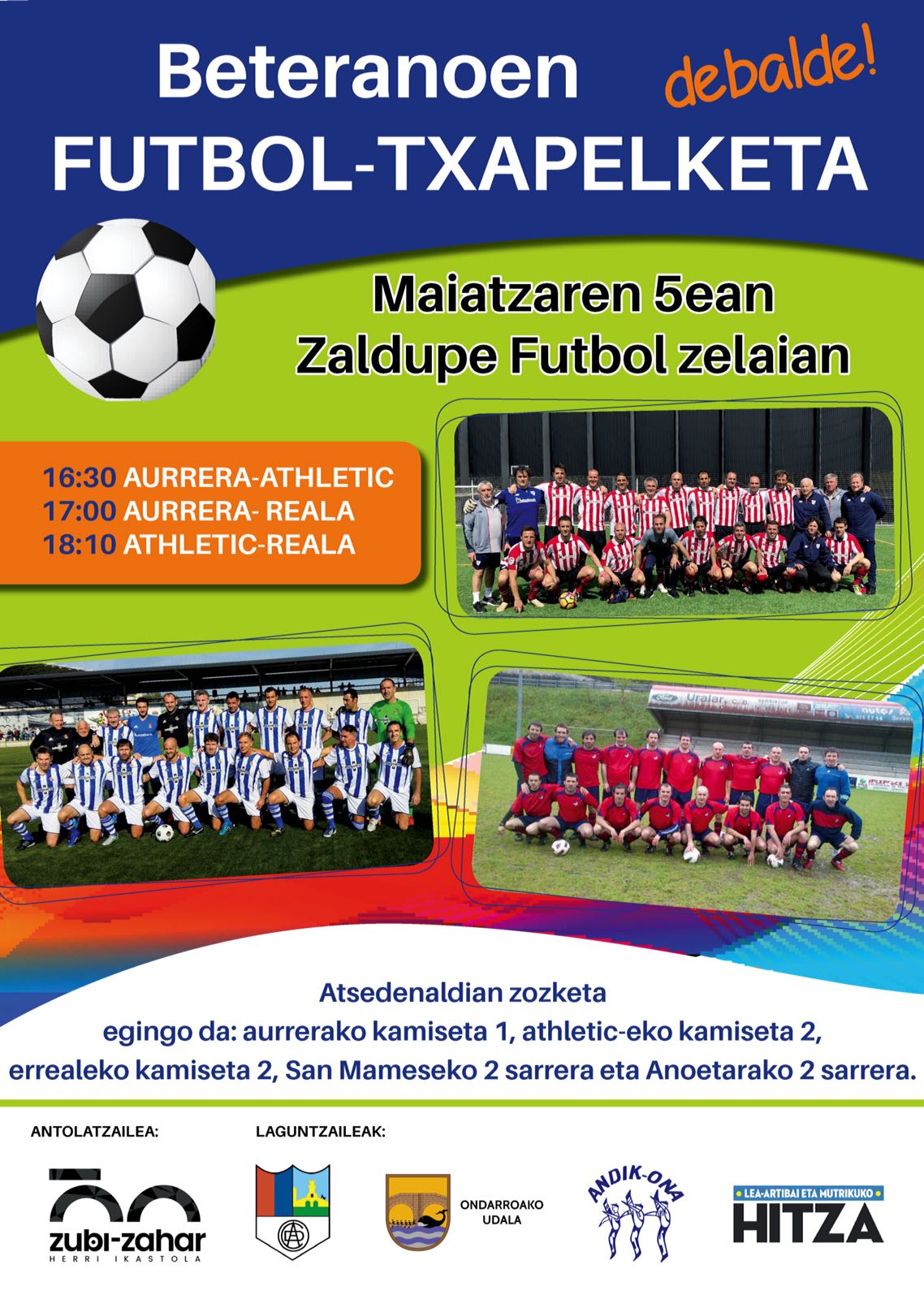 Ondarroa (Bizkaia), 5 de mayo de 2018. Las Asociaciones de Ex Jugadores del Athletic Club y de la Real Sociedad, junto a los anfitriones del Aurrera de Ondarroa, participaron en el triangular conmemorativo por el 50 aniversario de la ikastola Zubi-Zahar.