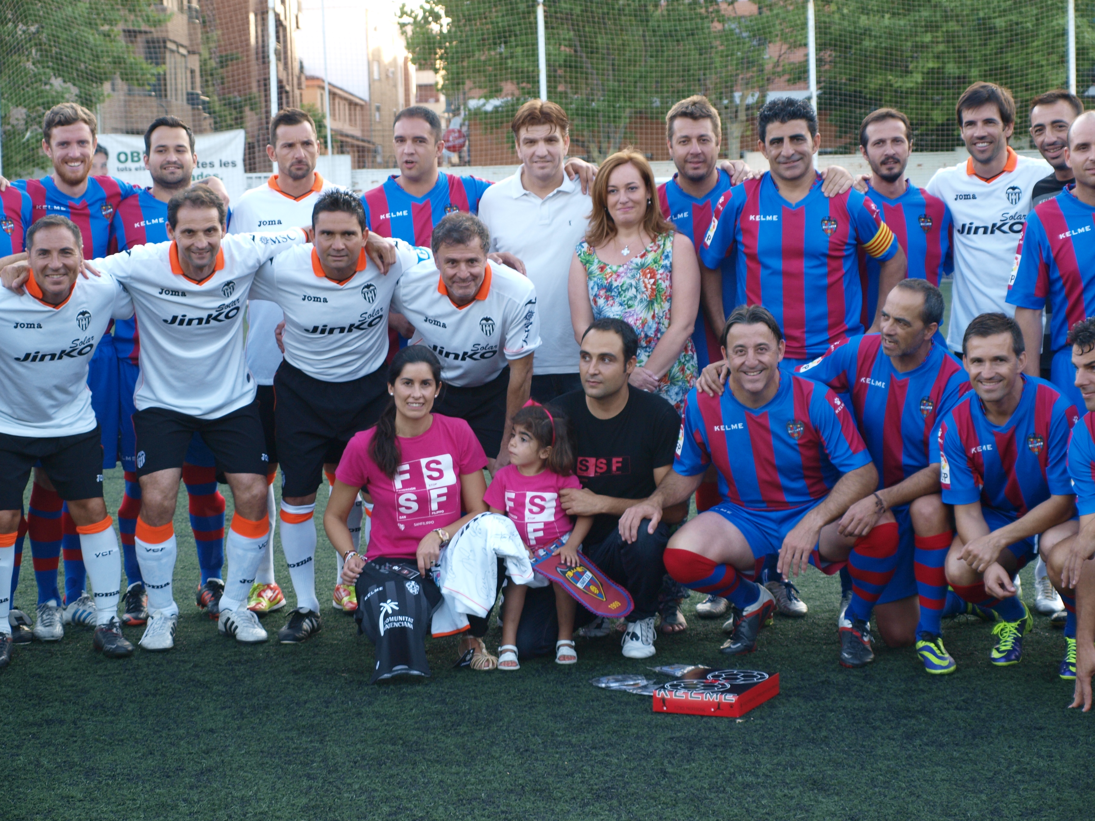 Aldaia (Valencia), 23 de julio de 2014. Las Asociaciones de ex futbolistas del Valencia CF y el Levante UD disputaron un partido benéfico en el Polideportivo de Aldaia, con el objetivo de recaudar fondos para Daniela, una pequeña que sufre el síndrome Sanfilippo y que necesita tres millones de euros para tratar su enfermedad.