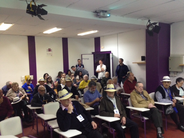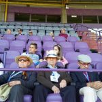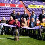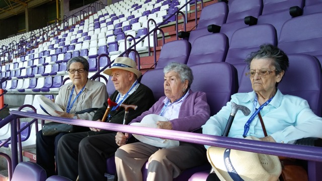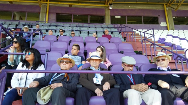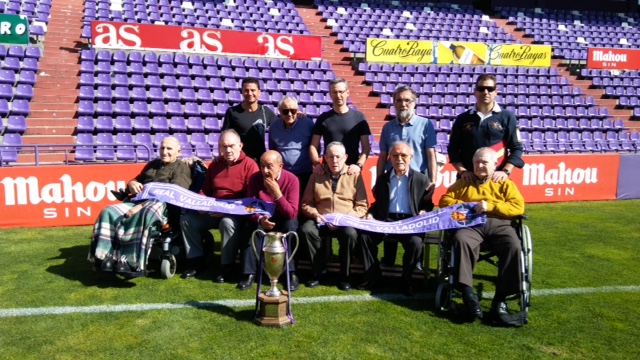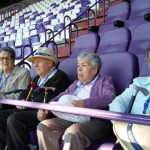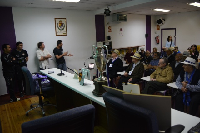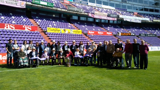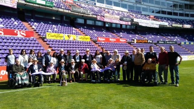 Valladolid, 10 de abril de 2017. Los participantes en los Talleres de Fútbol «Reminiscencia» FEAFV & AFE que se están implementando en la Residencia Ballesol de Valladolid y el Centro Sociosanitario Hermanas Hospitalarias de Palencia visitaron el Estadio pucelano José Zorrilla. Allí pudieron pisar el precioso césped del campo de fútbol, conocer el palco y la sala de prensa y tocar en directo algunos de los trofeos más importantes conquistados por el club blanquivioleta a lo largo de su historia.