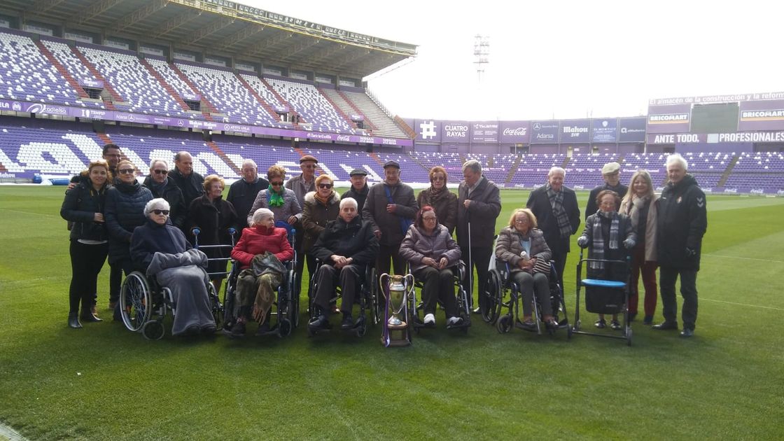 Valladolid, 19 de marzo de 2019.Los participantes en el Taller de Futbol en la Residencia Ballesol La Victoria de Valladolid visitaron el pasado mes de marzo el Estadio del Real Valladolid acompañados por los ex jugadores Victor Fernández y Marcos- El capitán del equipo blanquivioleta Javi Moyano se acercó a saludar a los residentes.